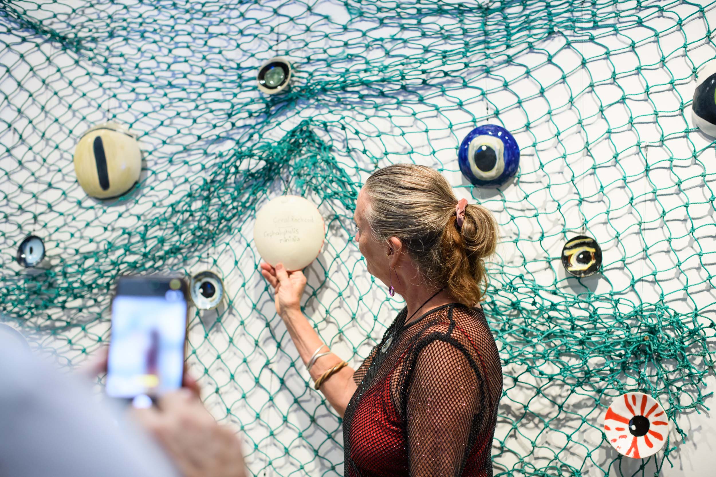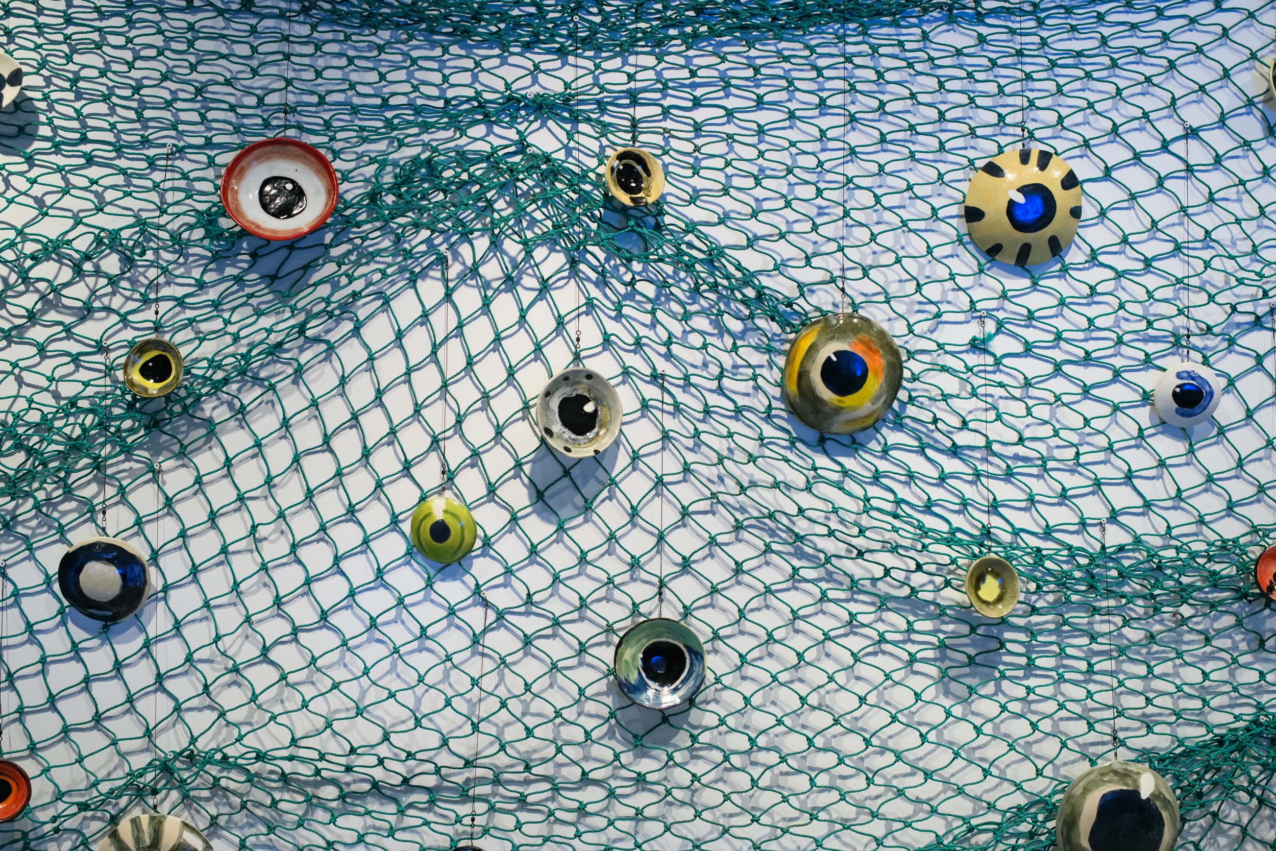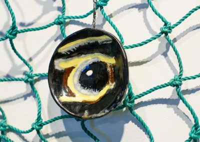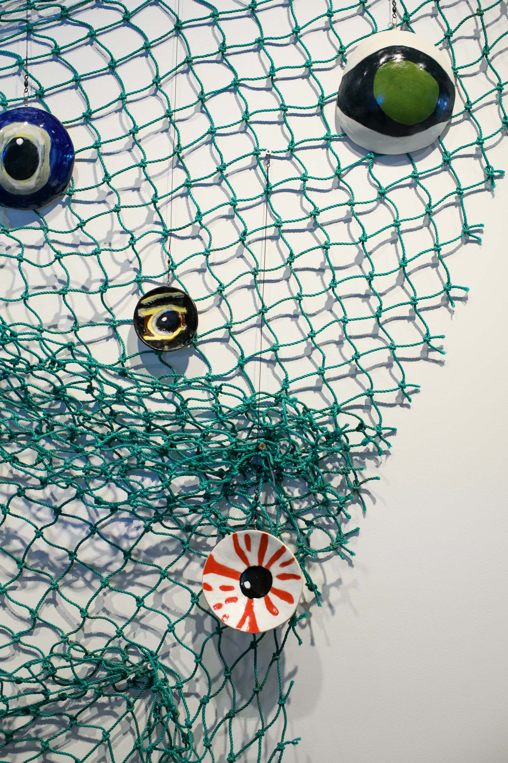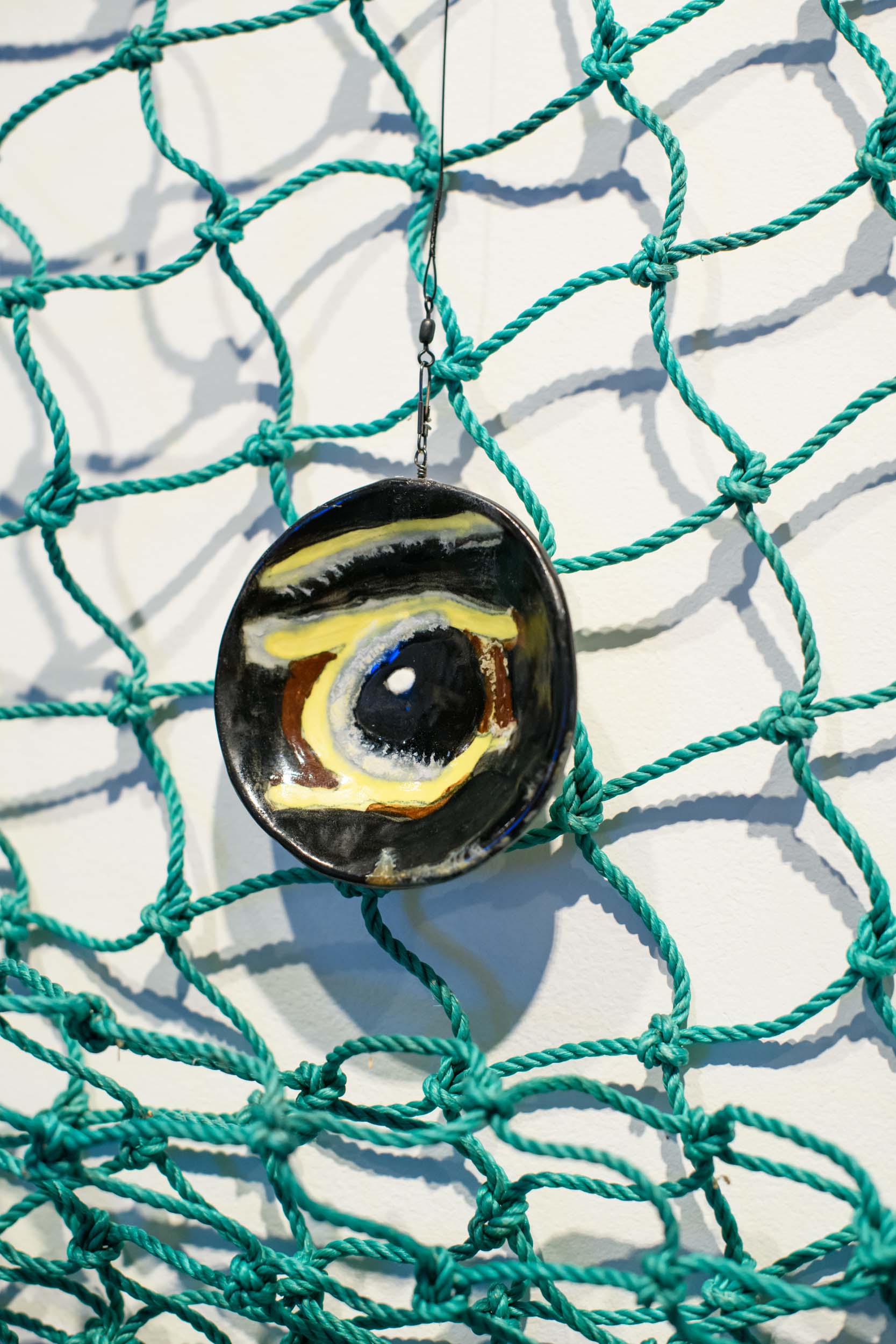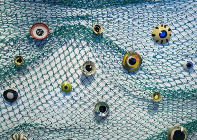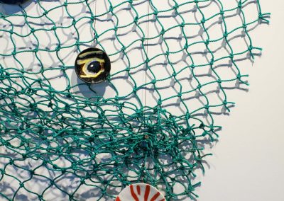The resulting installation comprises 43 unique ceramic fish‑eye plates, each one individually shaped, glazed, and fired to celebrate the distinct textures, colours, and patterns observed in marine life. Suspended delicately from lengths of fishing tackle and arranged across an expanse of reclaimed fishing net, the work transforms everyday maritime materials into a sculptural environment that evokes both the beauty and the fragility of ocean ecosystems. The use of salvaged netting also subtly acknowledges the impact of human activities on marine habitats while re‑contextualising these materials through an aesthetic lens.