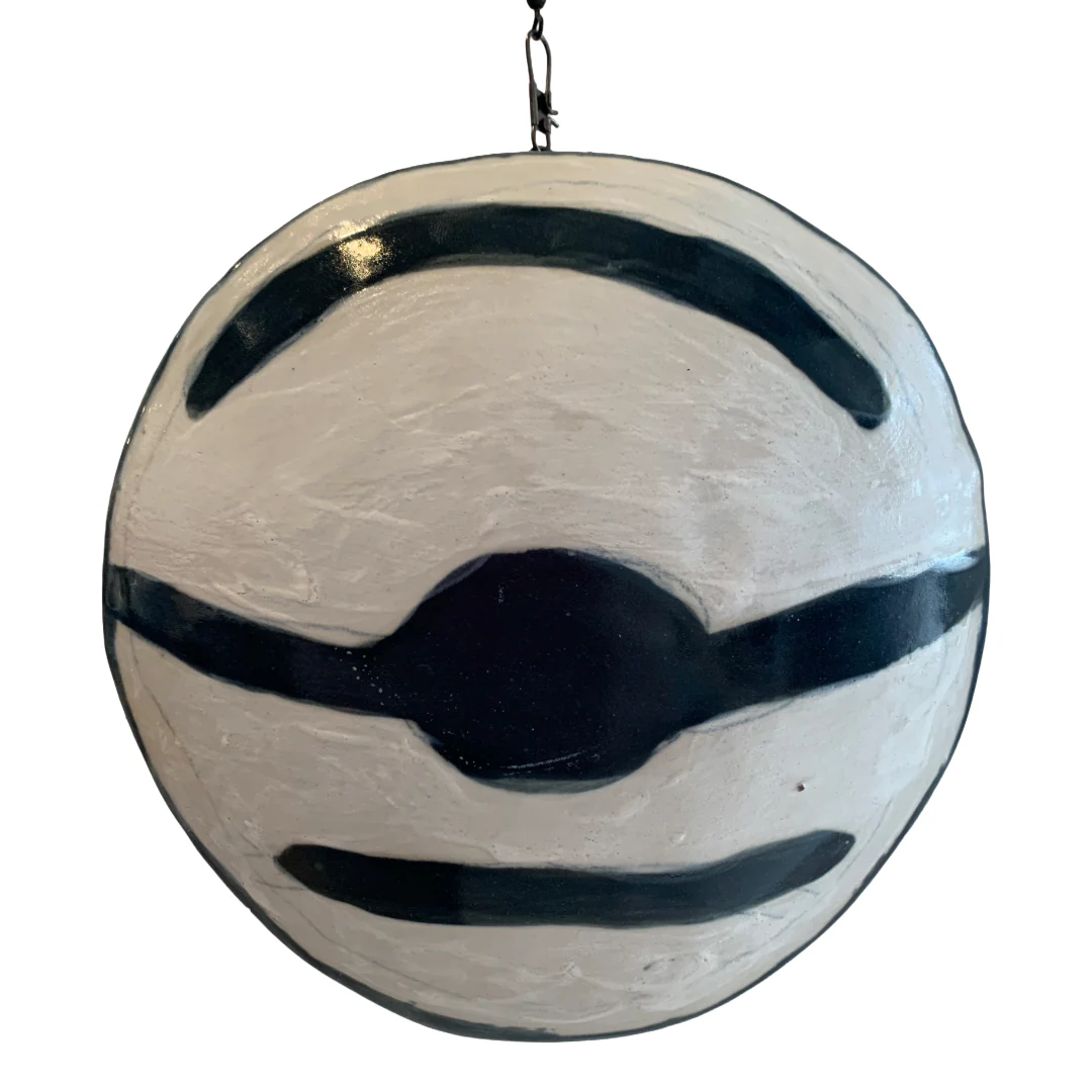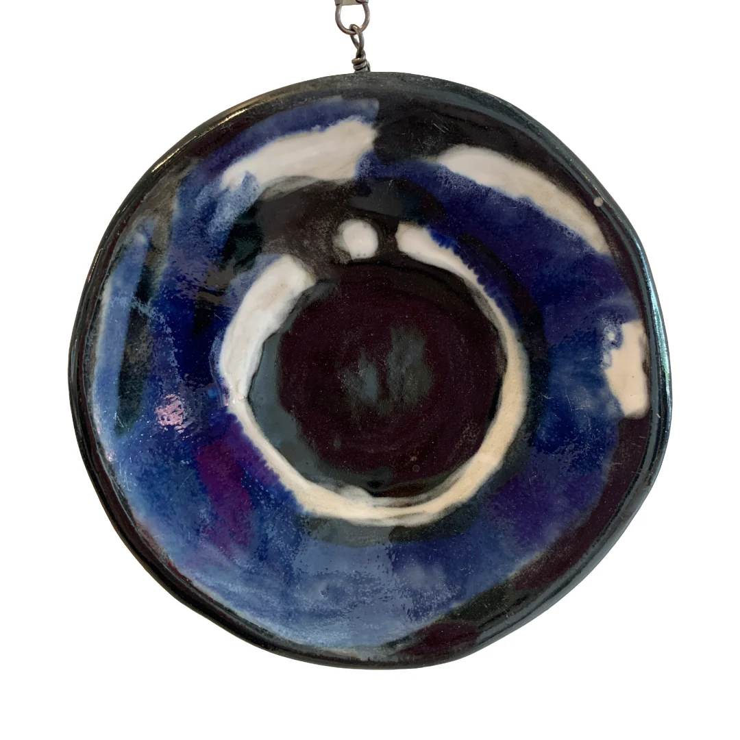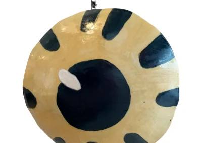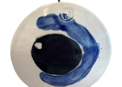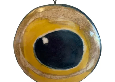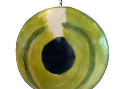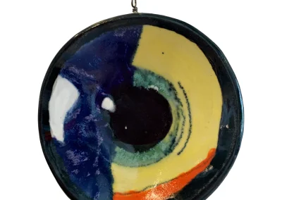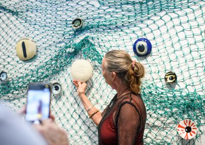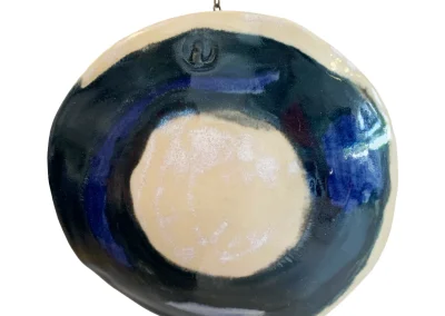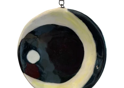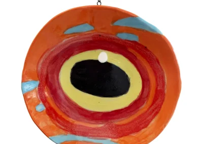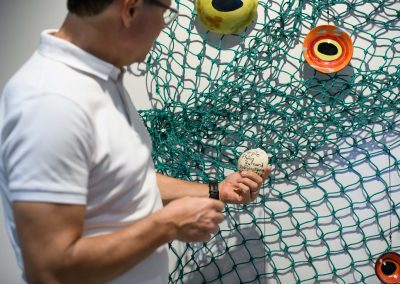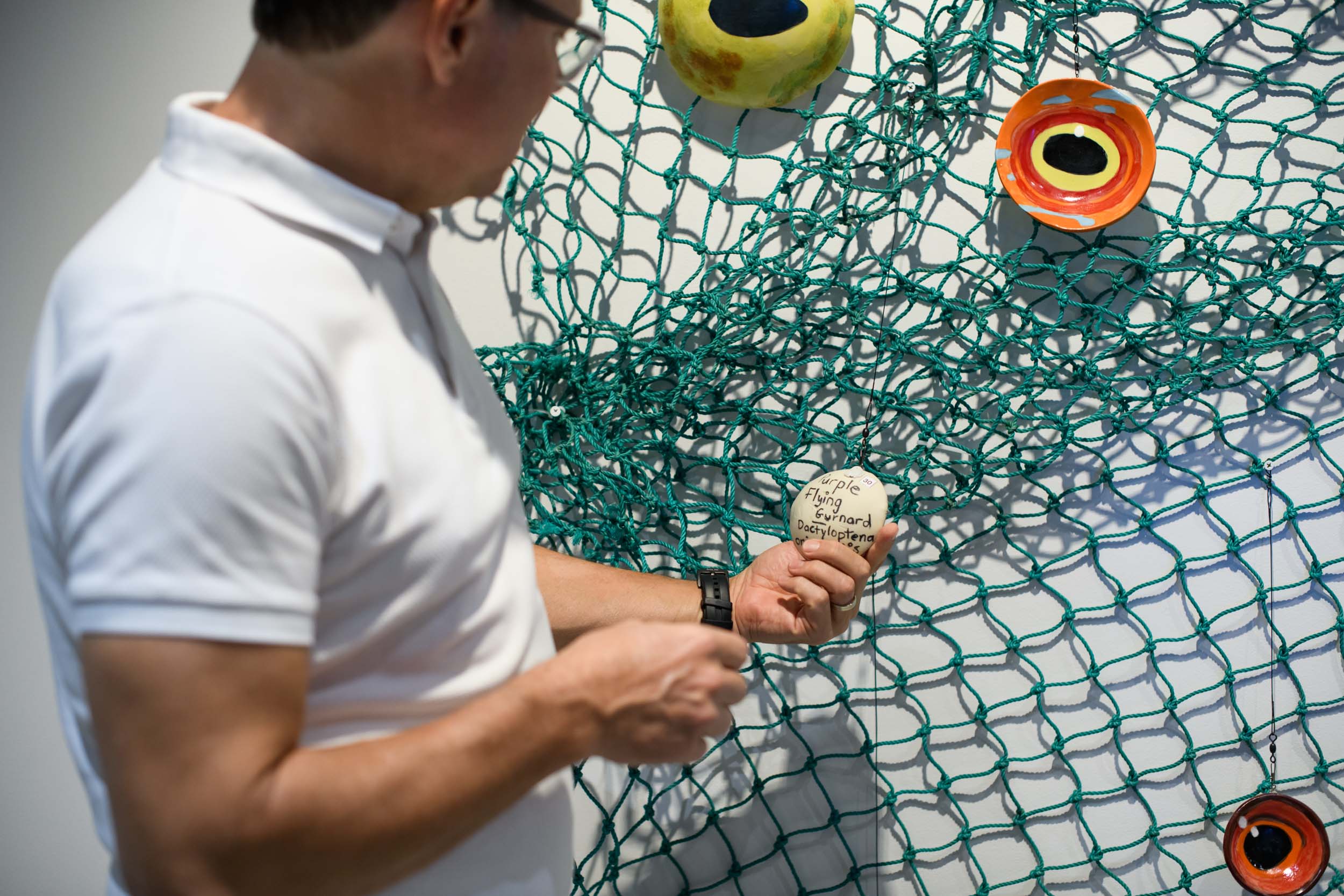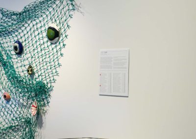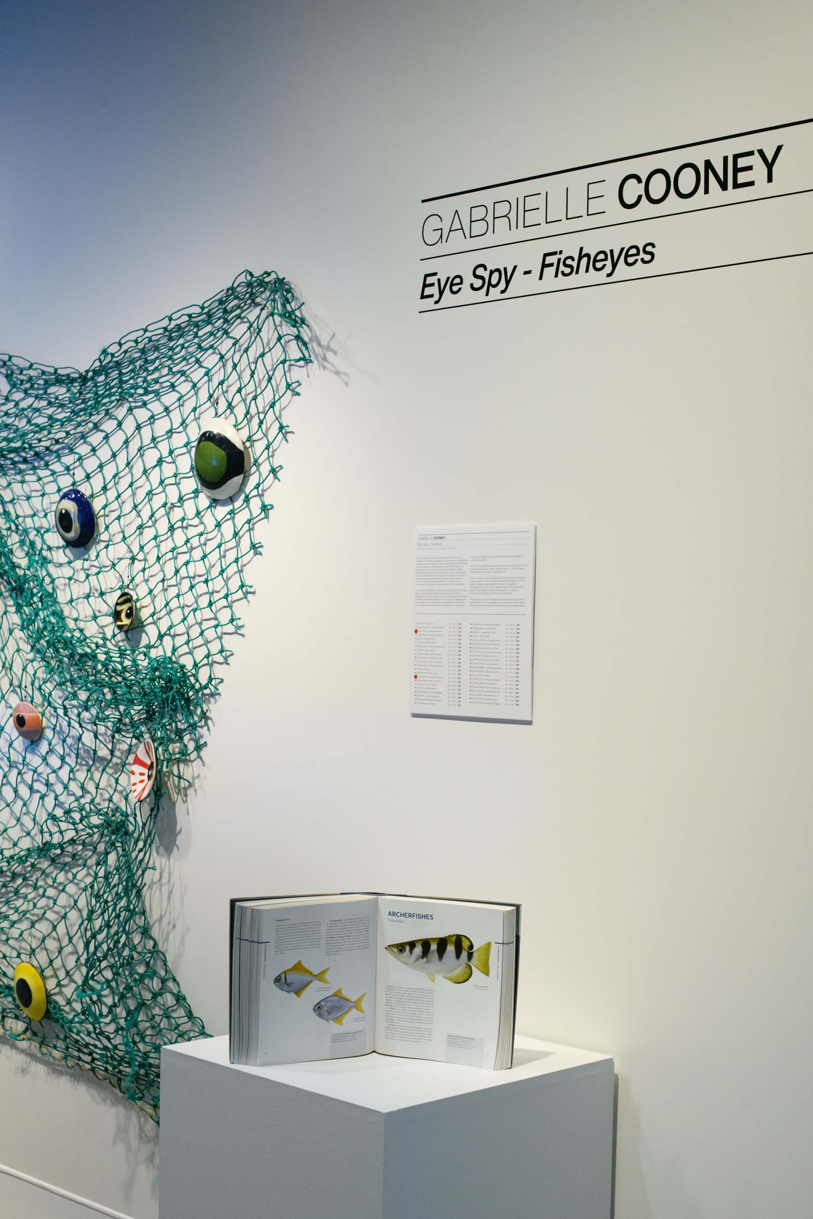 The resulting installation comprises 43 unique ceramic fish‑eye plates, each one individually shaped, glazed, and fired to celebrate the distinct textures, colours, and patterns observed in marine life. Suspended delicately from lengths of fishing tackle and arranged across an expanse of reclaimed fishing net, the work transforms everyday maritime materials into a sculptural environment that evokes both the beauty and the fragility of ocean ecosystems. The use of salvaged netting also subtly acknowledges the impact of human activities on marine habitats while re‑contextualising these materials through an aesthetic lens.