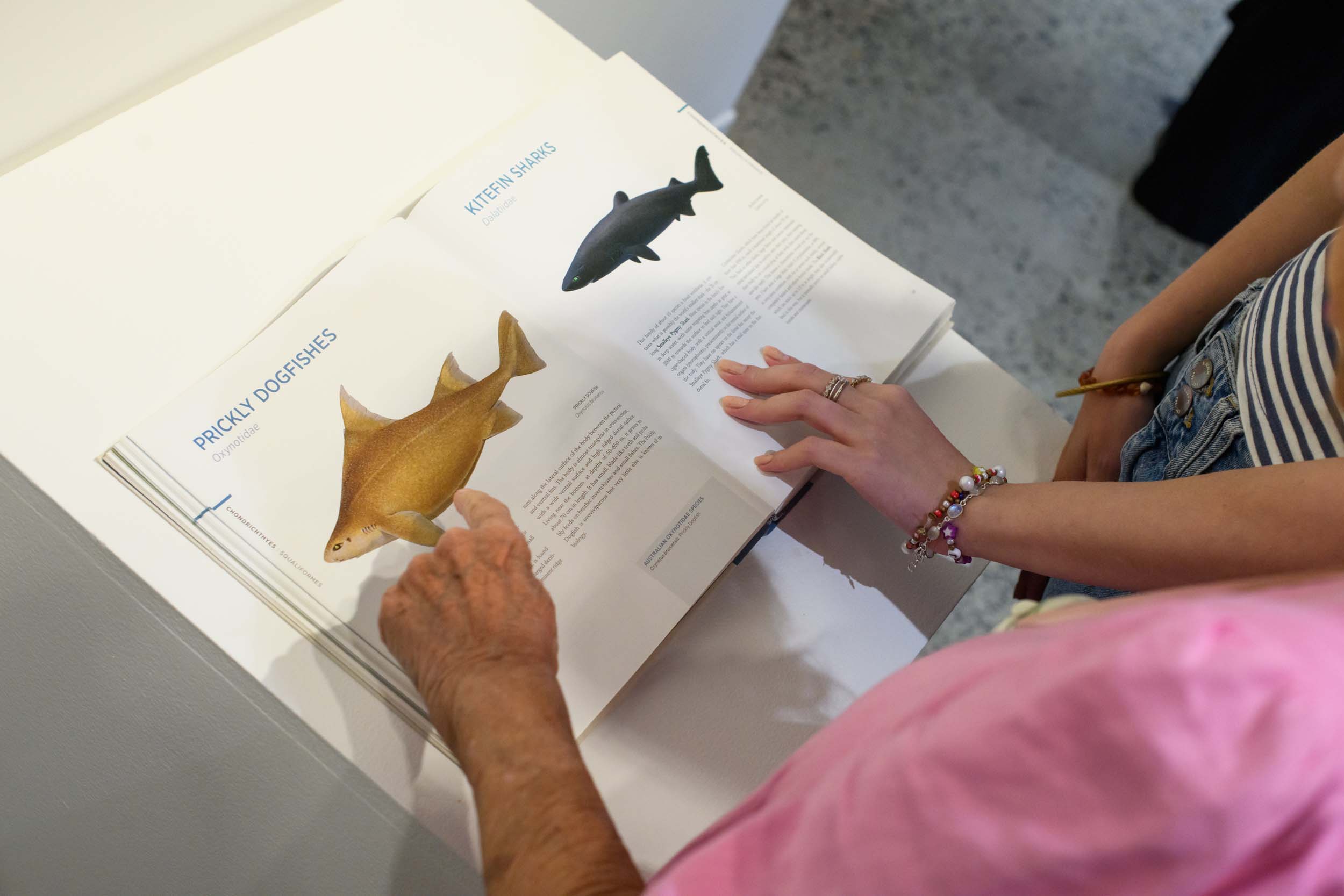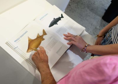 On the reverse of each ceramic plate, the artist has inscribed the scientific name of the fish family. Viewers are invited to turn the plates, engaging physically with the work to reveal the corresponding common and scientific names. This interactive element encourages curiosity and deepens the viewer’s connection to the biological diversity represented.