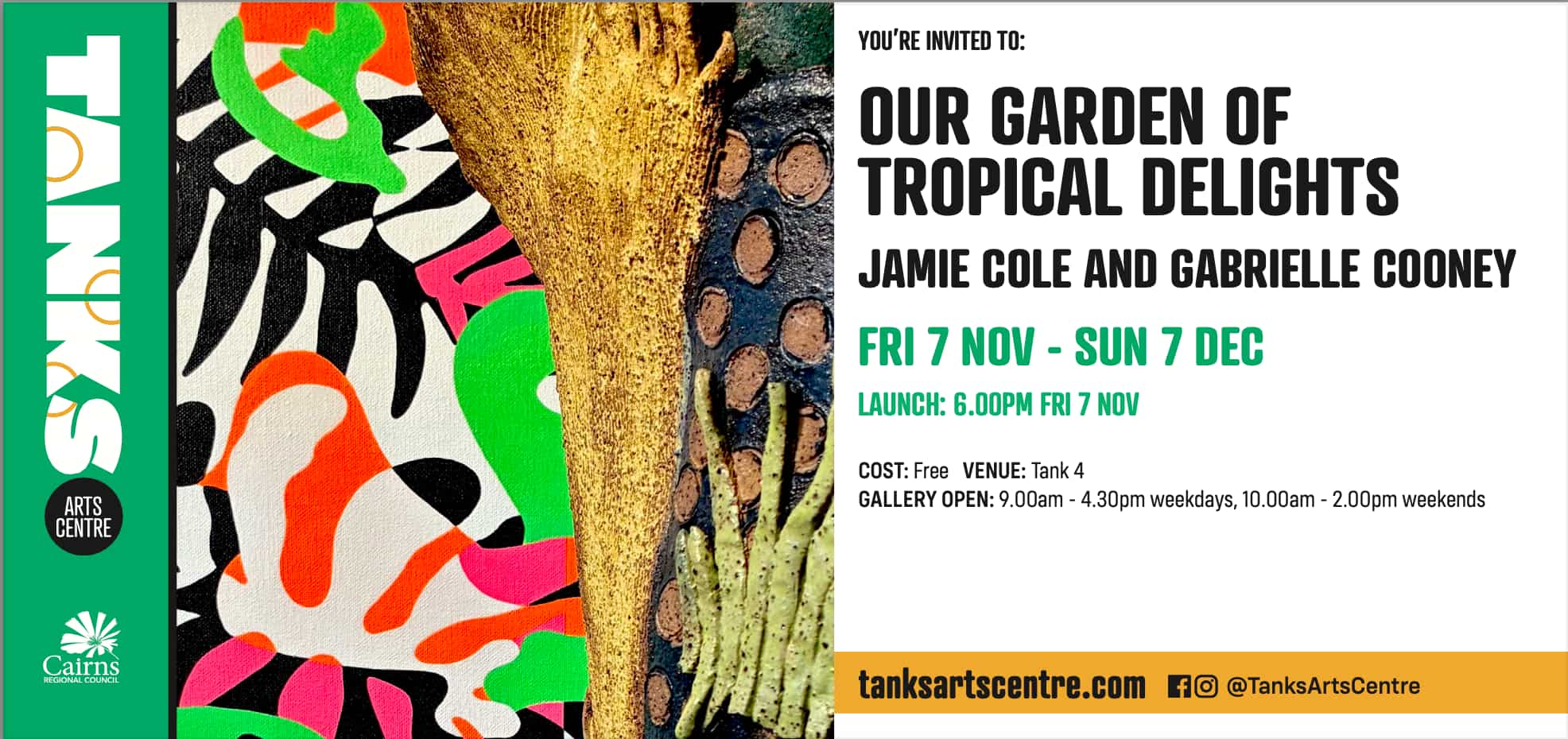 A huge thankyou to the Tanks Curation team, Jamie Cole, RADF Grant Funding and the Cairns Council for all their support. Family and Friends and the wider art community for all the positive feedback.